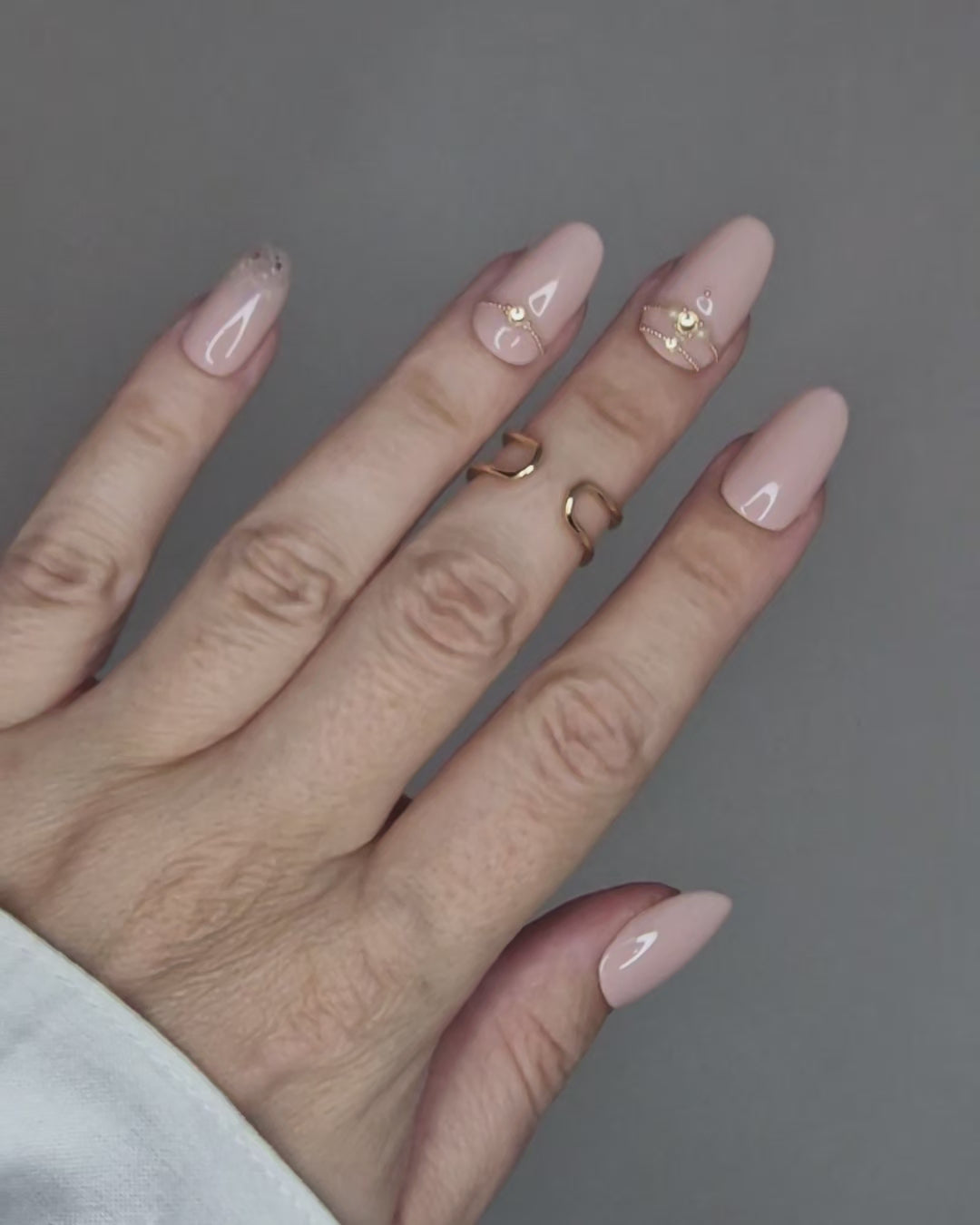 Ce set sophistiqué marie la finesse d’une teinte rosée à des ornements délicats, pour une manucure à la fois discrète et irrésistiblement raffinée.